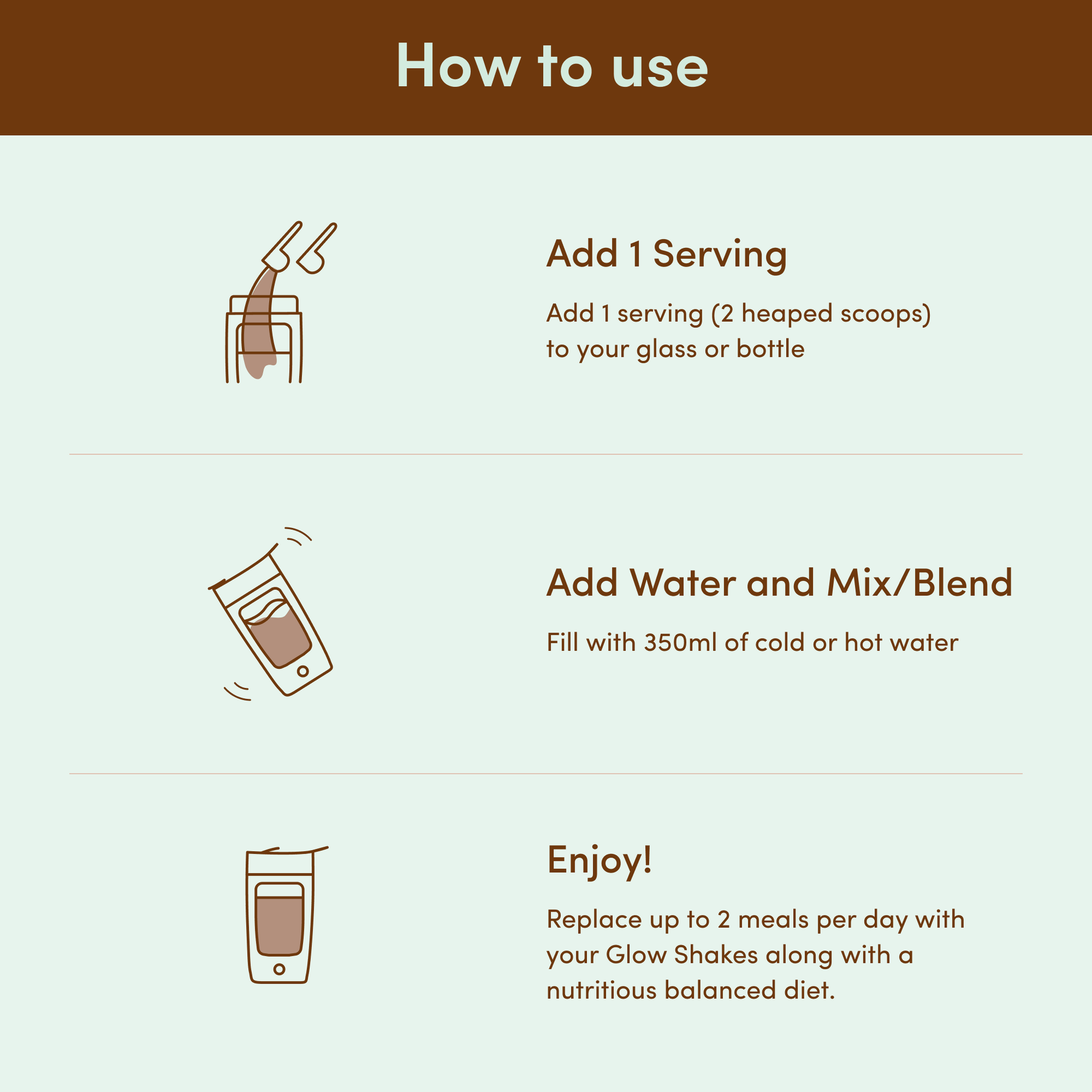 Enjoy! Replace up to 2 meals per day with your Glow Shakes along with a nutritious balanced diet.